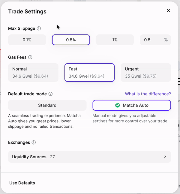 Whether you're new to Matcha or have been a regular trader on our website, you may have noticed we have a Trade Settings page in the Trade Module. This article will go over how to enable changes to your Settings and what their functionality entails.