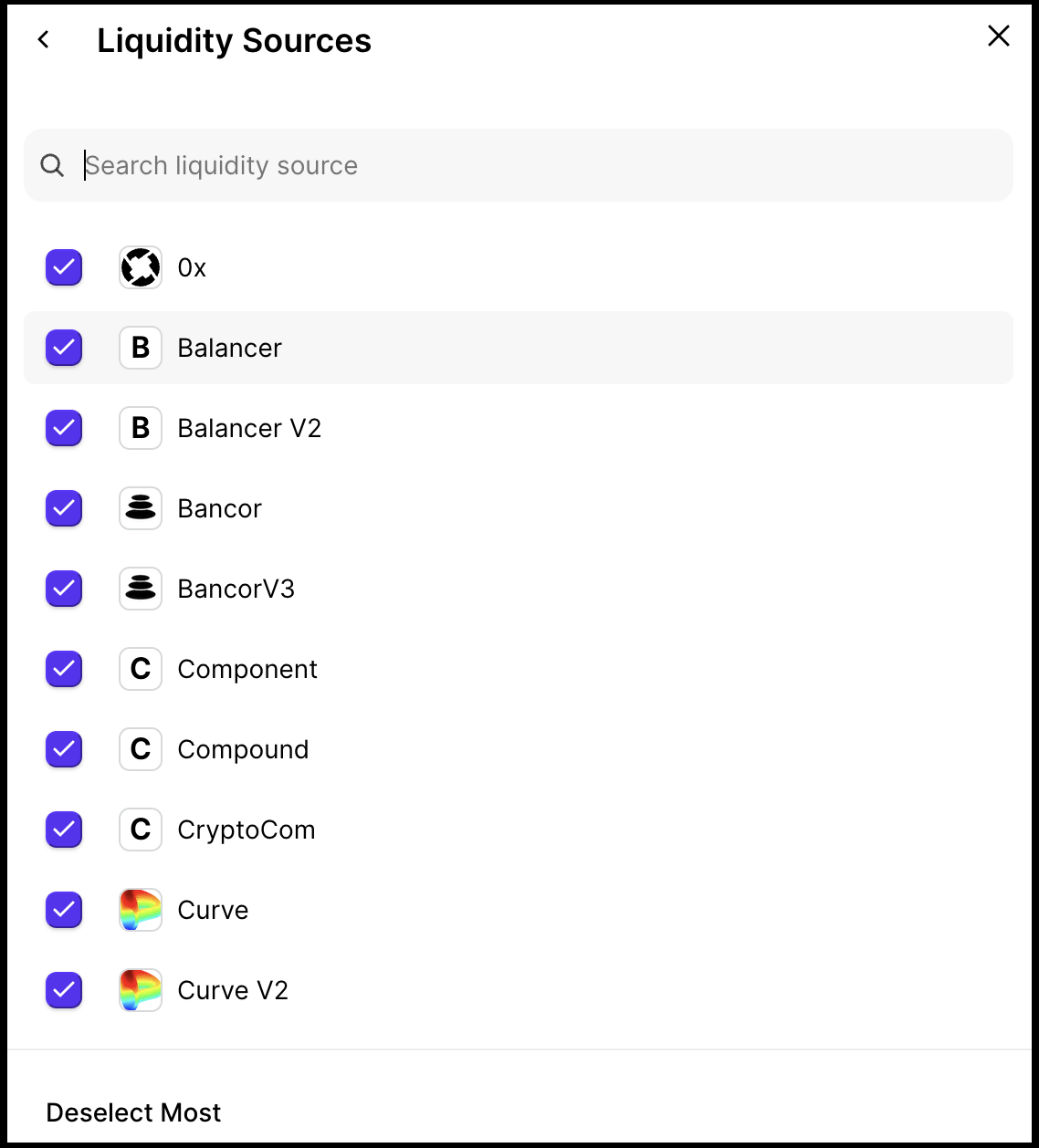 Clicking Deselect Most deselects every Liquidity Source except 0x.