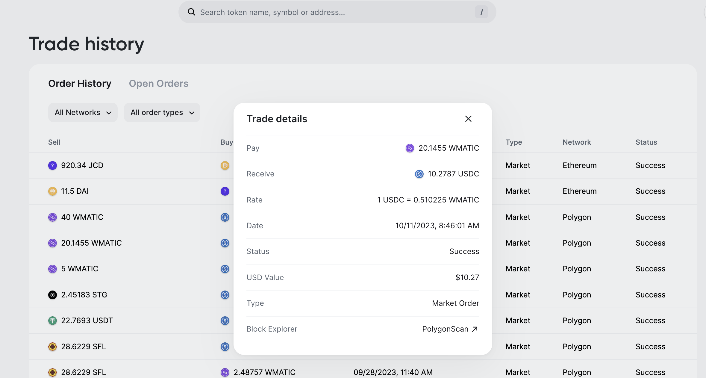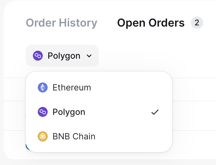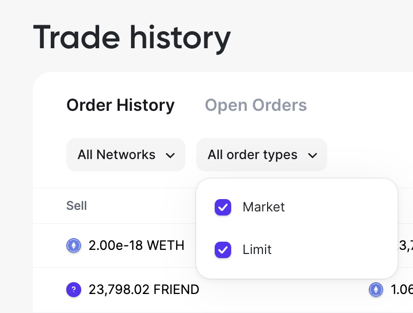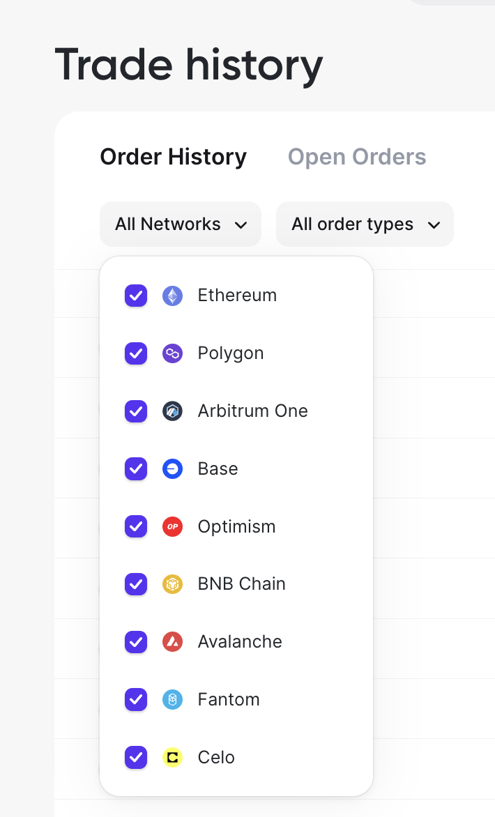To locate your orders a bit more efficiently, you can also filter your orders by Blockchain network and Order Type (Market or Limit Order):