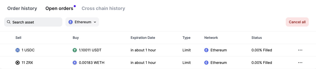 *Note: Cancel all can only be done on a single blockchain at a time. So if you have multiple orders on Ethereum and BSC and want to cancel all of them, you will have to cancel the orders for Ethereum first and then BSC (or vice versa).
