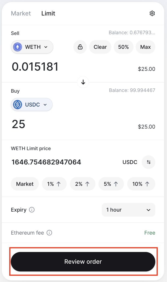 *Note: You have the option of switching the Buy token with the Sell token by clicking the arrow in the center of the widget, but you should check the inputs to make sure they are what you want them to be after you switch.