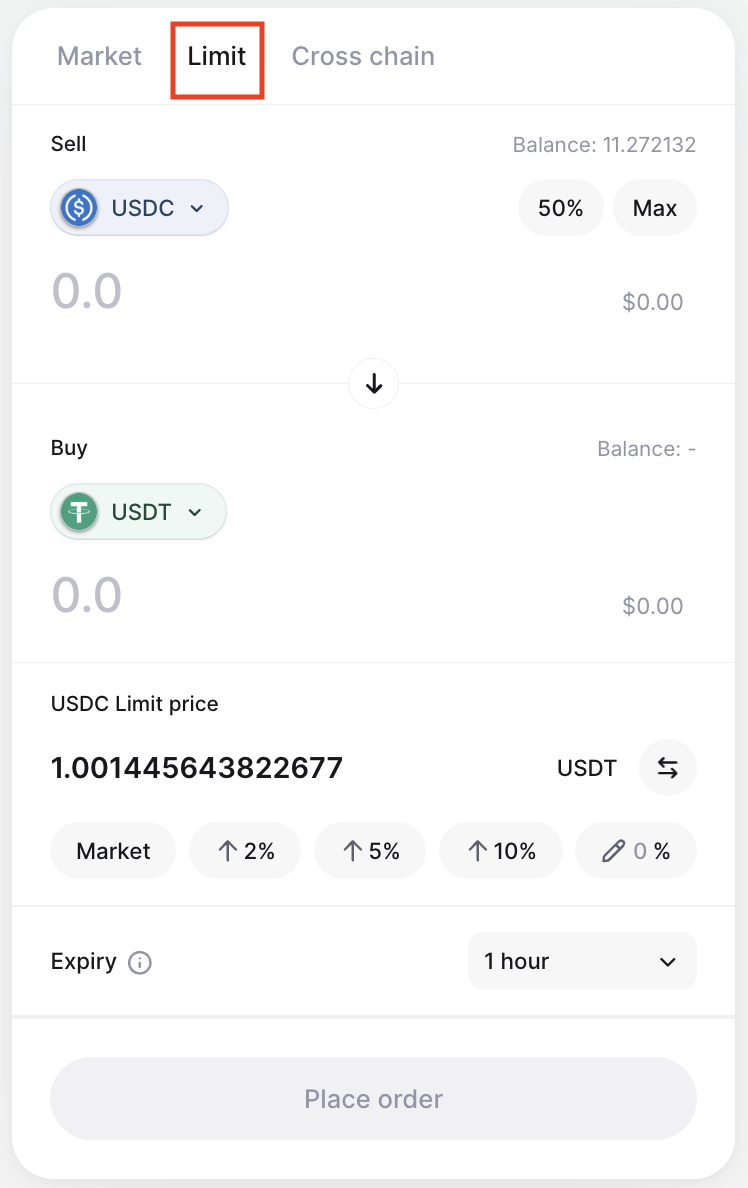 In order to place a limit order, you first must make sure you are trading an ERC-20 token (e.g. WETH, USDC, DAI, etc.). If you only have native tokens like ETH, MATIC, or BNB, you can Wrap the token to the ERC-20 standard and continue to place the Limit Order.