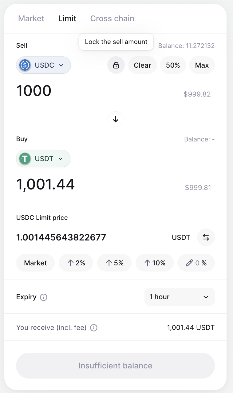 You also have the option of locking in the Sell amount with the 🔒 icon next to the Clear button. This allows you to fix the Sell amount and adjust the Buy amount to what you would like it to be.