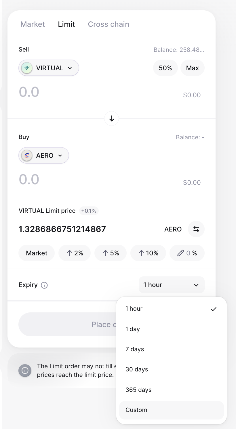 The duration of the limit order. You can choose from 1 hour, 1 day, 7 days, 30 days, or 365 days. You also have the option of entering a Custom Date for your order.