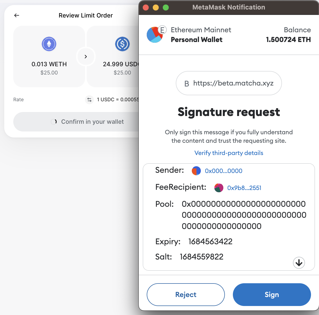 You will be prompted by your Wallet application to sign limit order approval. Go ahead and click "Sign".