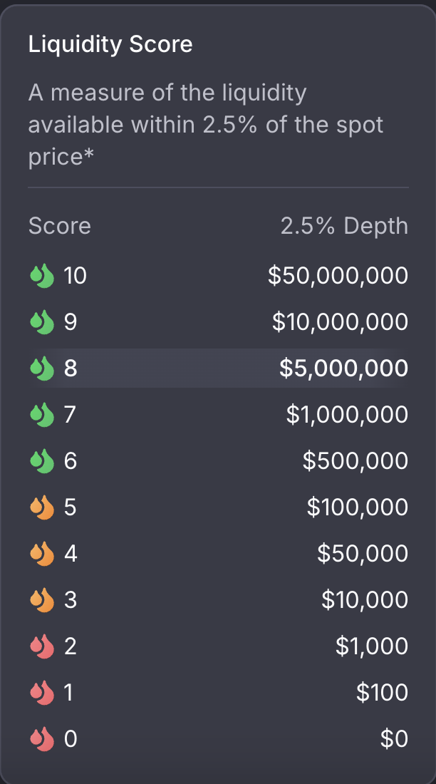 The Liquidity Score indicates how many tokens are available at the displayed price and how large a trade the market can handle without causing a price impact of 2.5% or more.